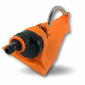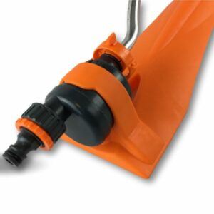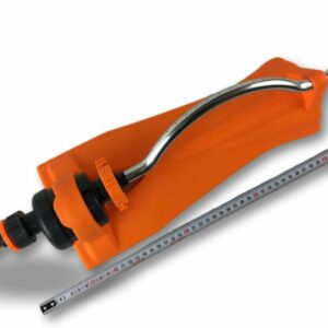 > Arroseur oscillant à 15 trous, au corps en plastique de couleur orange, avec bras oscillant en aluminium, possibilité de raccordement à des tuyaux d arrosage de diamètre de 13 à 19 mm, dimension de l’appareil: 48 cm