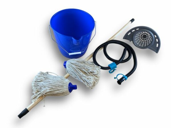 L’ensemble de nettoyage comprend également un manche en bois d’une longueur de 1,40 m, un panier essoreur en plastique, et deux serpillières en coton à franges avec un tressage spécial pour une absorption optimale. Un kit complet pour un nettoyage en profondeur