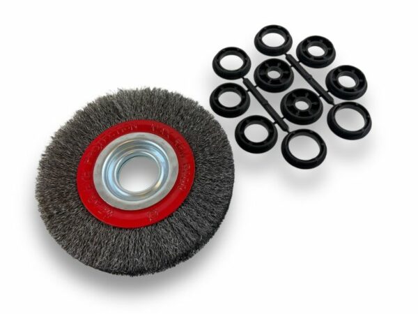 > Cet accessoire existe en différents diamètres extérieurs de 150, 200, et 250 mm. Sa largeur brossante est d’environ 25 mm . Son alésage est de 32 mm + bagues de réduction de 32/25 32/22 32/20 32/16 et 32/12 mm