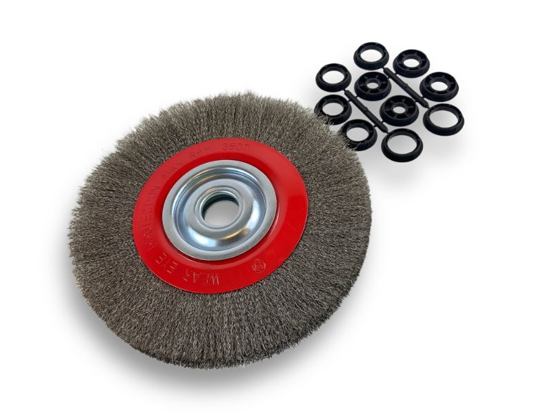 brosse circulaire métallique diamètre touret banc établi machine alésage acier inox laiton décapage ébavurage brossage meulage nettoyage dur agressive souple polissage réducteur adaptateur ébavure
