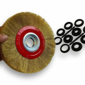 > Cet accessoire existe en différents diamètres extérieurs de 150, 200, et 250 mm. Sa largeur brossante est d’environ 25 mm . Son alésage est de 32 mm + bagues de réduction de 32/25 32/22 32/20 32/16 et 32/12 mm
