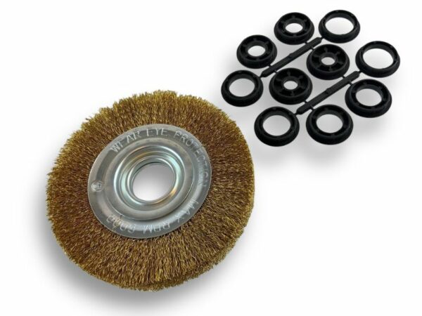 > Cet accessoire existe en différents diamètres extérieurs de 150, 200, et 250 mm. Sa largeur brossante est d’environ 25 mm . Son alésage est de 32 mm + bagues de réduction de 32/25 32/22 32/20 32/16 et 32/12 mm