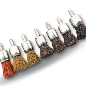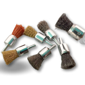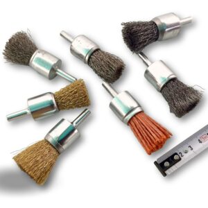 > Ces brosses circulaires existent en | Différentes diamètres : 12-18-22-28 mm | Différents fils : souple (0,20 mm) et dur (0,30 mm) | Différents matériaux : acier, inox, laiton, nylon abrasif (grain 80)
