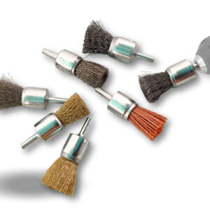 > Brosse rotative métallique en bout forme pinceau sur tige prévue pour être monté facilement sur tout type de mandrin de perceuse ou visseuse standard ou mini visseuse