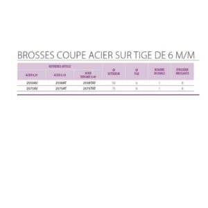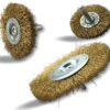 > Ces brosses circulaires existent en | Différentes diamètres : 50-75 mm | Différents fils : souple (0,20 mm) et dur (0,30 mm) | Différents matériaux : acier, inox, laiton, nylon abrasif (grain 80)