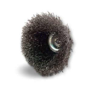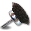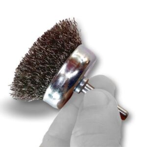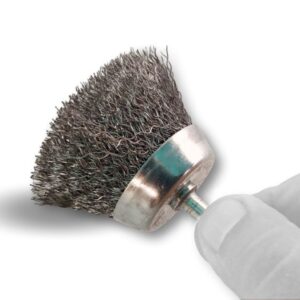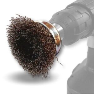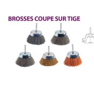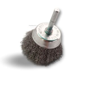 > Brosse rotative métallique en forme coupe sur tige prévue pour être montée facilement sur tout type de mandrin de perceuse ou visseuse standard ou mini visseuse