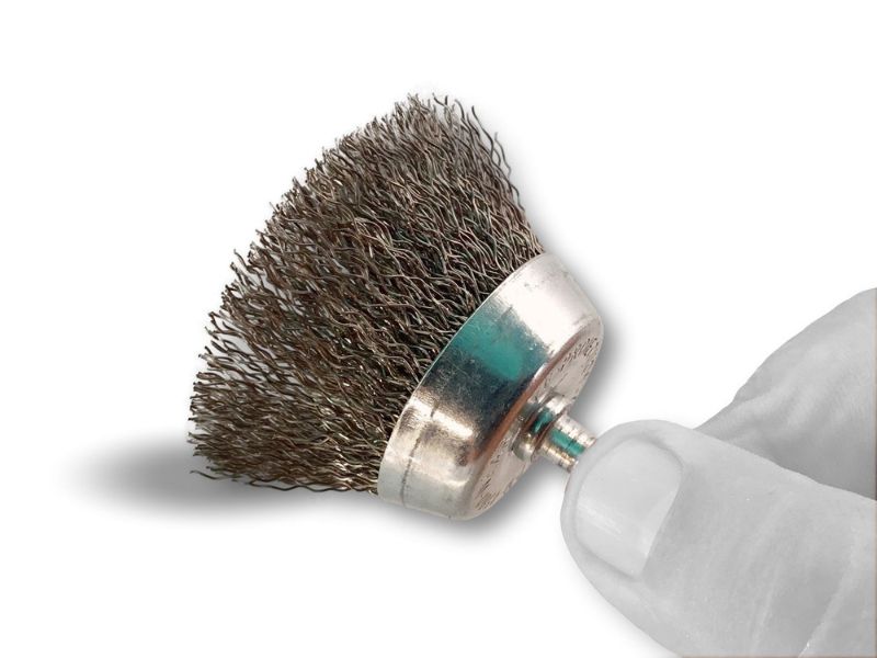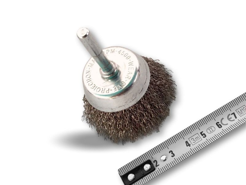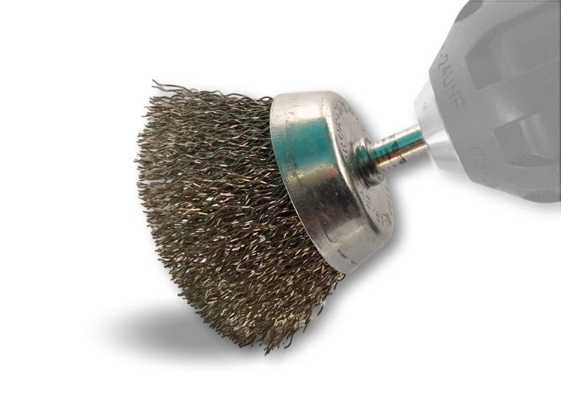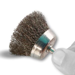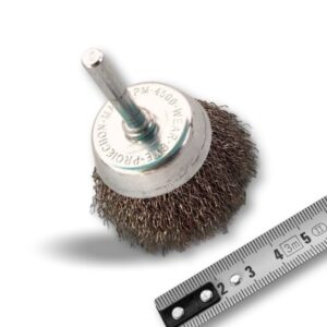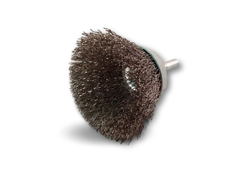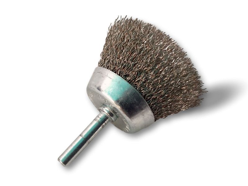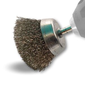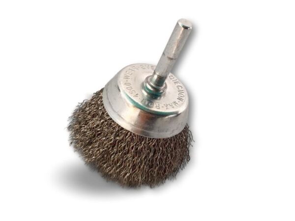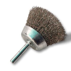 > Brosse rotative métallique en forme coupe sur tige prévue pour être monté facilement sur tout type de mandrin de perceuse ou visseuse standard ou mini visseuse