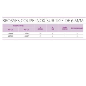 > Ces brosses circulaires existent en | Différentes diamètres : 50 – 75 mm | Différents fils : souple (0,20 mm) et dur (0,30 mm) | Différents matériaux : acier, inox, laiton, nylon abrasif (grain 80)