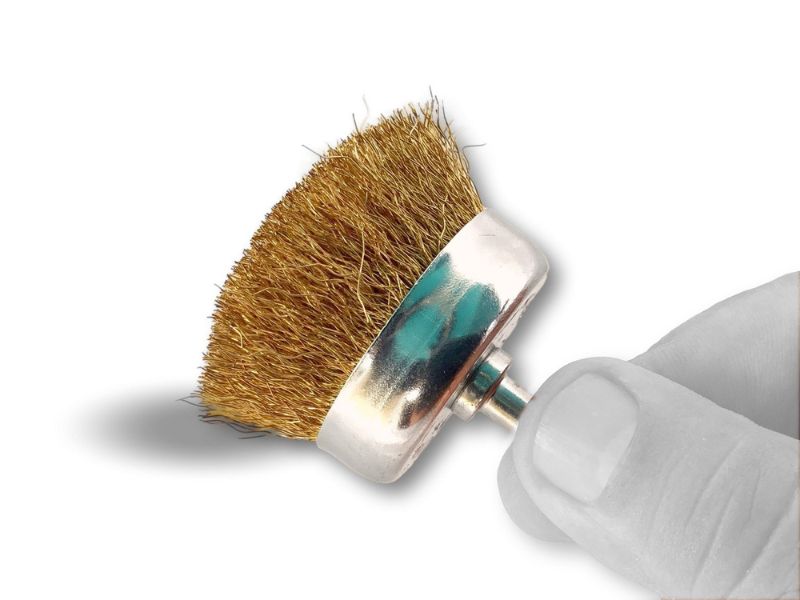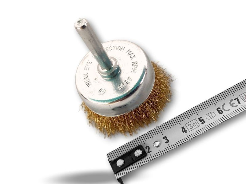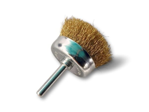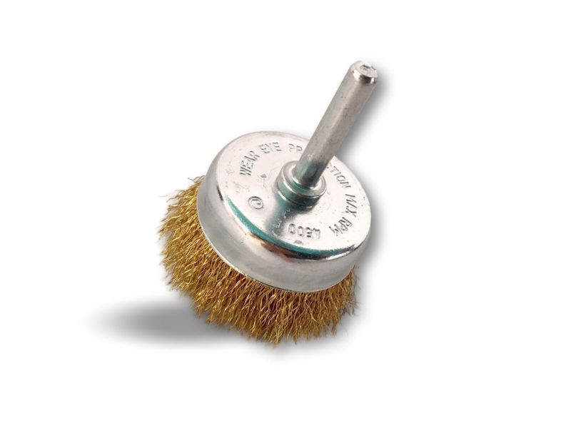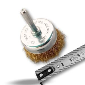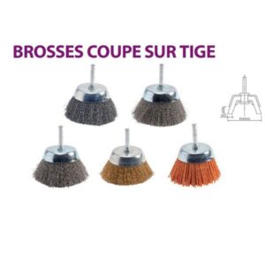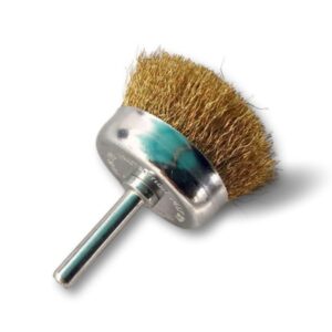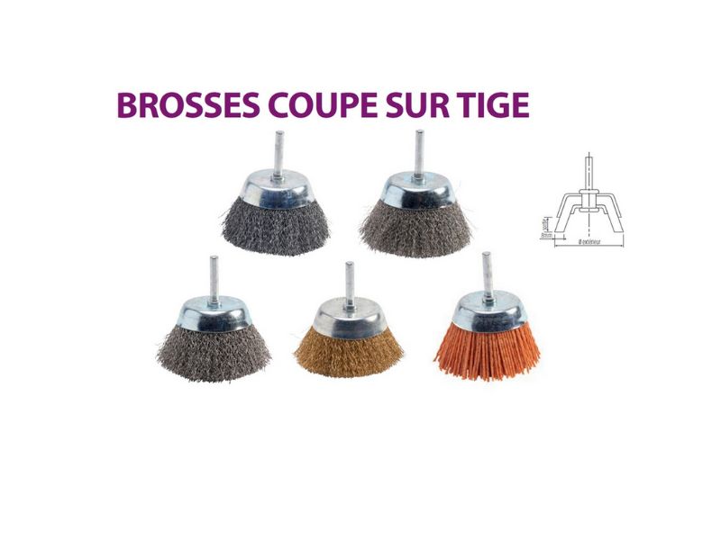 > Brosse rotative métallique en forme coupe sur tige prévue pour être monté facilement sur tout type de mandrin de perceuse ou visseuse standard ou mini visseuse