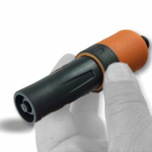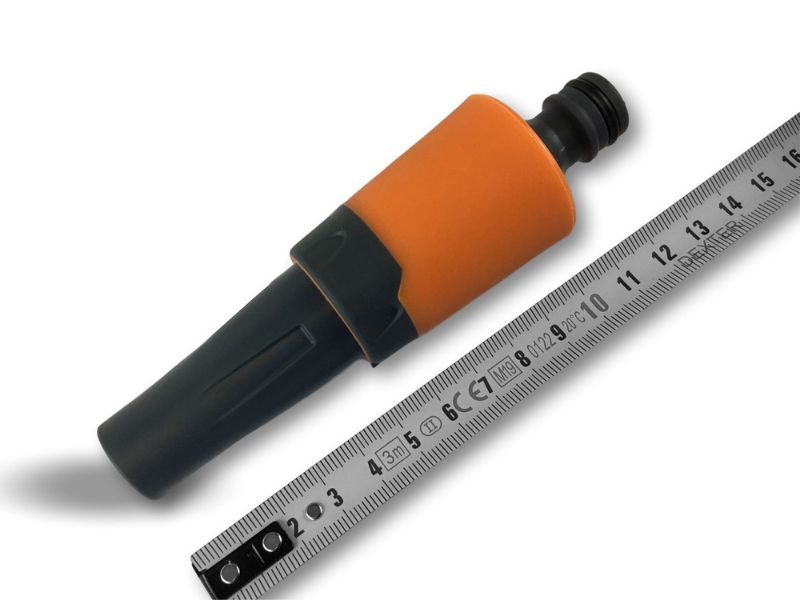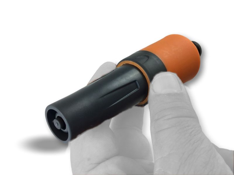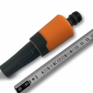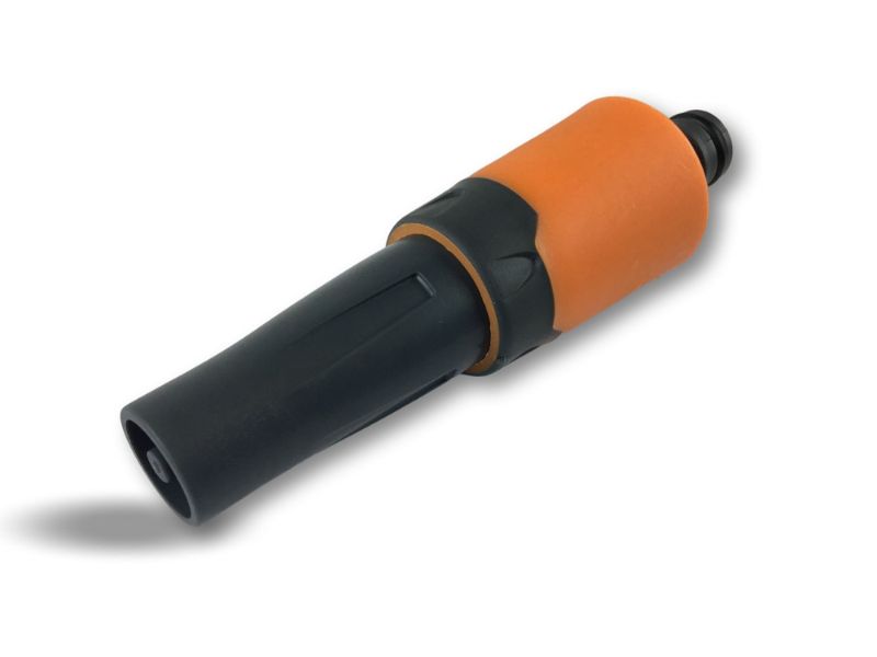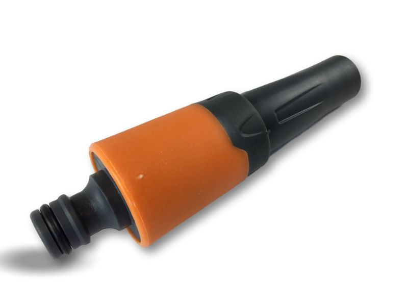 > Buse de tuyau réglable, de couleur bicolore: noir et orange, la lance est bi-matière plastique : PP et ABS, depuis une brumisation légère un puissant jet d’eau