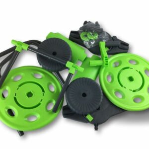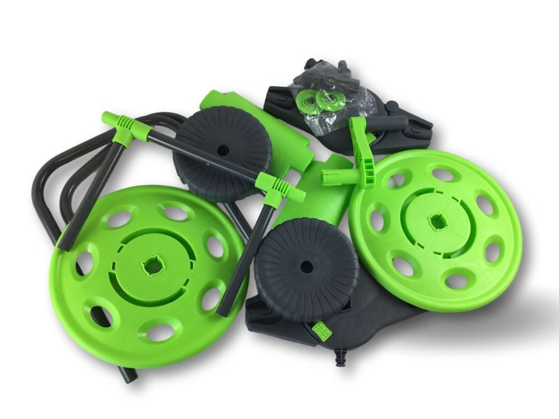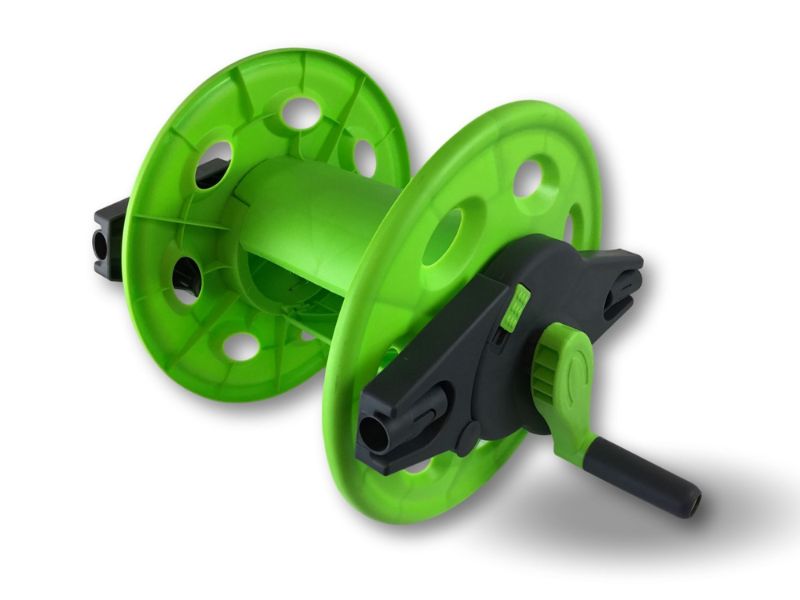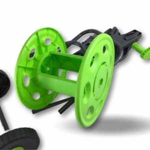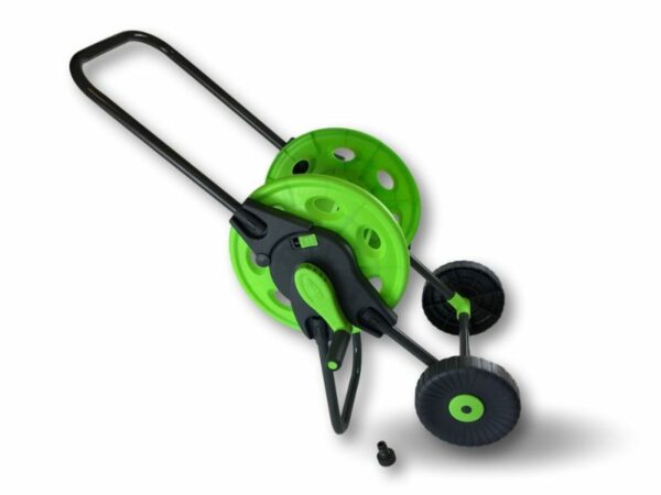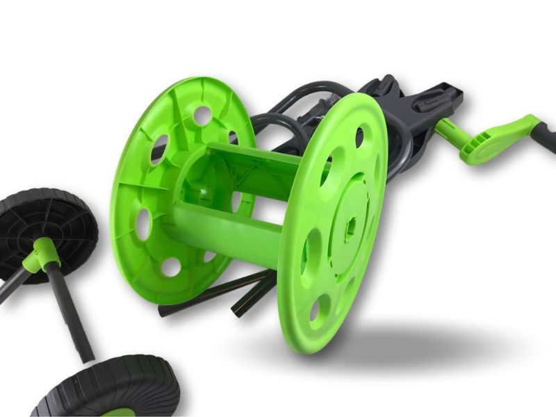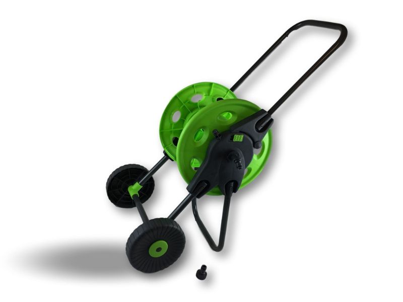 > Chariot porte tuyau portable, pour le stockage de 45 mètres de tuyau, le matériel est en : Acier, PP, ABS, il est livré démonté sans tuyau, prévu pour un enroulement manuel par manivelle du tuyau, poignée pliable pour rangement