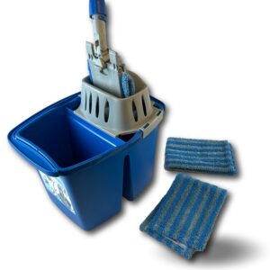 Ce kit de nettoyage comprend 2 franges Micro Easy, un manche télescopique en aluminium, un seau double compartiment et un panier essoreur.