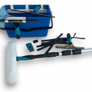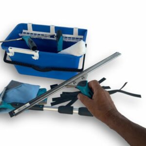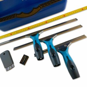 Mouilleur, 3 raclettes de longueur 25, 35 et 45 cm, seau, perche manche télescopique ainsi qu’un grattoir de poche de 4 cm et chiffon microfibre pour les finitions, éliminant ainsi toutes traces difficiles à retirer.
