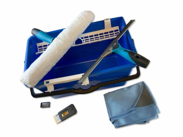 > KIT laveur de vitres hyper pro comprenant 1 seau 18 litres , 1 mouilleur 35 cm avec poignée bi-matière, 1 raclette Moerman 35 cm, 1 grattoir à vitre de poche de 4 cm + lames de rechange et 1 chiffon microfibre vitre 40×60 cm