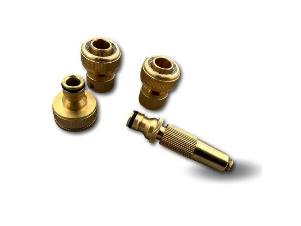 > Ce kit complet en laiton est composé d’un connecteur tétine libre et d’un autre waterstop qui servent de jonction entre un tuyau et une tétine, d’un adaptateur robinet 3/4′ et 1′ et d’une buse d’arrosage réglable