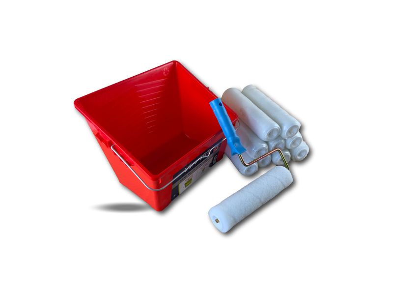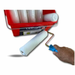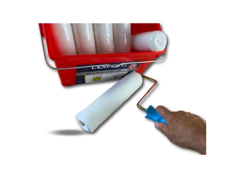> Ensemble de peinture comprenant 1 seau de 8 litres avec une grille d’essorage intégrée XXL, 10 manchons polyester poils longs longueur 250 mm et une monture.