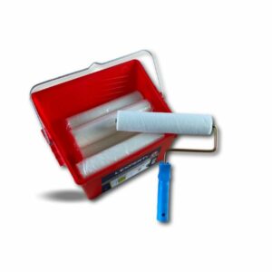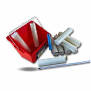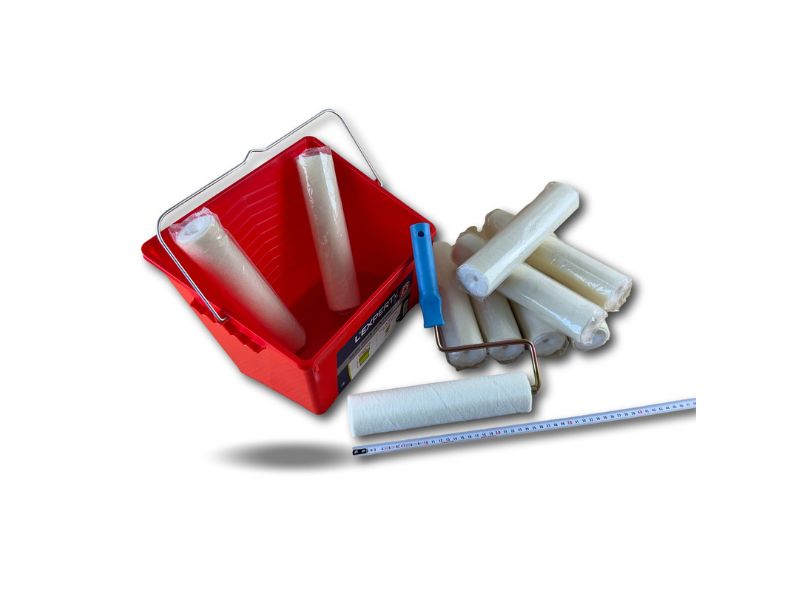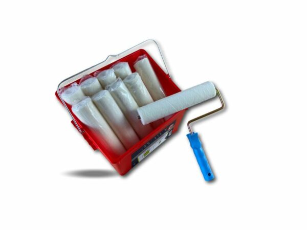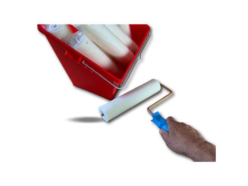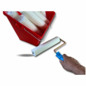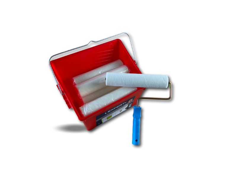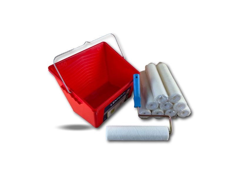 > Ensemble de peinture comprenant 1 seau de 8 litres avec une grille d’essorage intégrée XXL, 10 manchons laqueur velours longeur 250 mm et une monture.