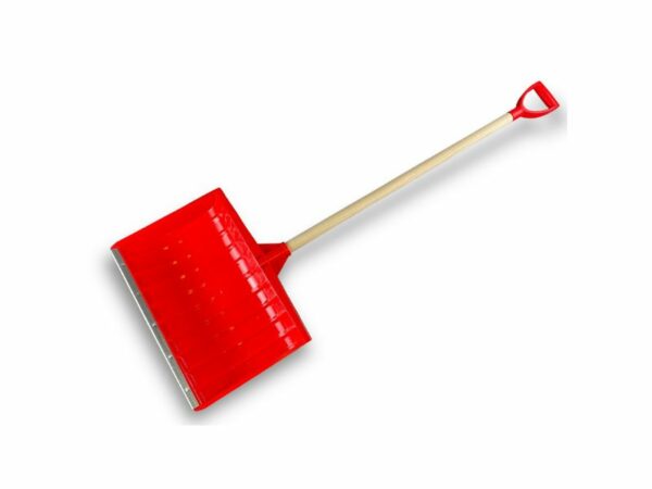 > Pelle à neige poussoir renforcé rouge avec manche en bois et poignée. Longueur 53 cm.