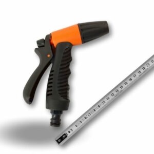 > Pistolet buse de tuyau réglable, de couleur bicolore: noir et orange, la lance est bi-matière plastique : PP et ABS, depuis une brumisation légère un puissant jet d’eau, Pour des fleurs délicates une légère brume sera parfaite. L’irrigation des arbres supporte un arrosage plus intense