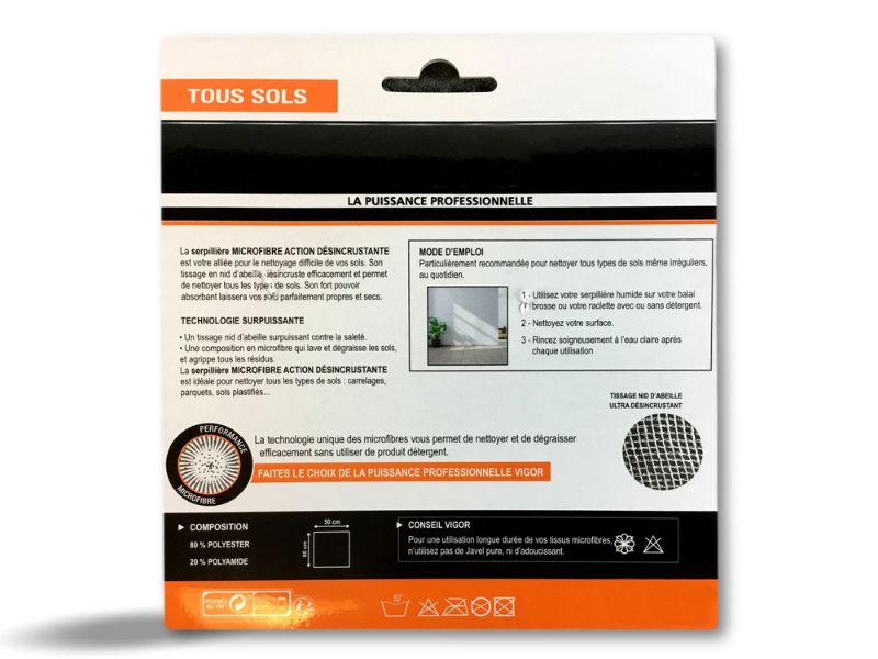 > Cette serpillère est fabriquée en microfibre qui lave et dégraisse tous les sols et les débarrasse de tous les résidus. Elle est tout à fait adaptée au nettoyage en profondeur de tous les types de sols, même irréguliers, carrelages, stratifiés, parquets, sols plastifiés