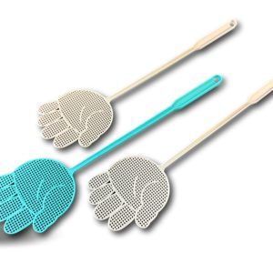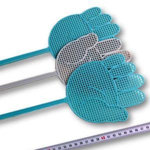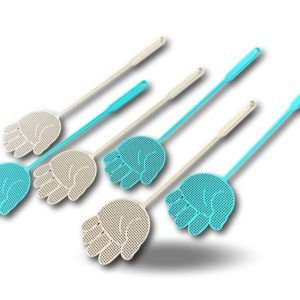 > Cette tapette à mouche de couleur bleu ou gris est réalisée en plastique souple et non toxique, en polypropylène. Elle est en forme de main ajourée ce qui lui confère un design original